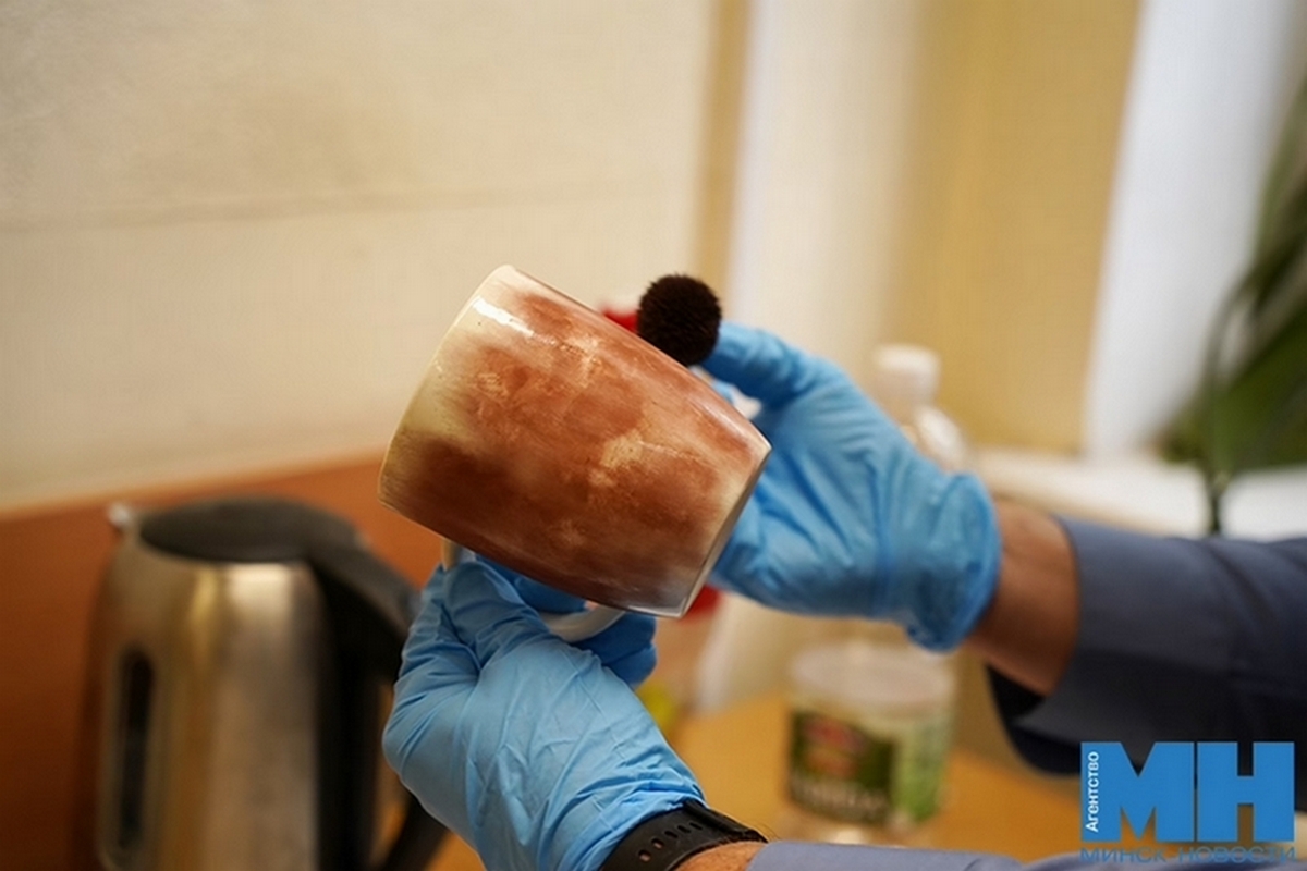 — Приехав по вызову, специалист сразу определяет границы осмотра места происшествия, — рассказывает старший оперативный дежурный управления Государственного комитета судебных экспертиз по г. Минску подполковник юстиции Денис Кузьменко. — В нашем случае очевидно, что подозреваемая могла оставить следы пальцев рук на кружке и пустой таре.