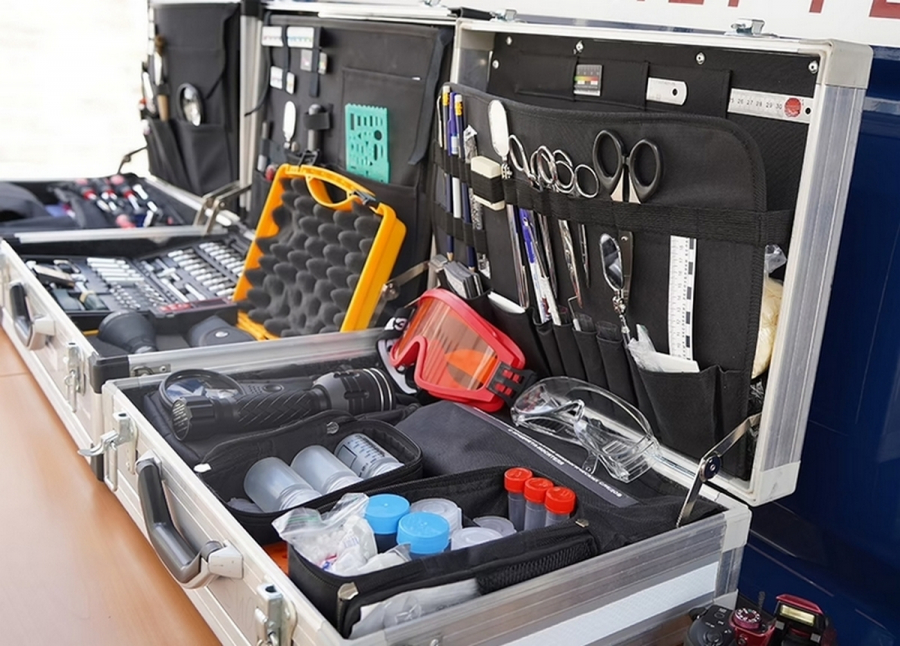 В чемодане специалиста десятки различных предметов: резиновые перчатки, порошки, кисти, упаковочный материал, линейки, в том числе на магнитной основе, лазерный дальномер, лупа, зеркало на телескопической ручке, специальные рамки для залития гипсовых следов, шпатели и многое другое, что может пригодиться при осмотре места происшествия и изъятии следов. Вес такого кейса — около 10-11 кг.